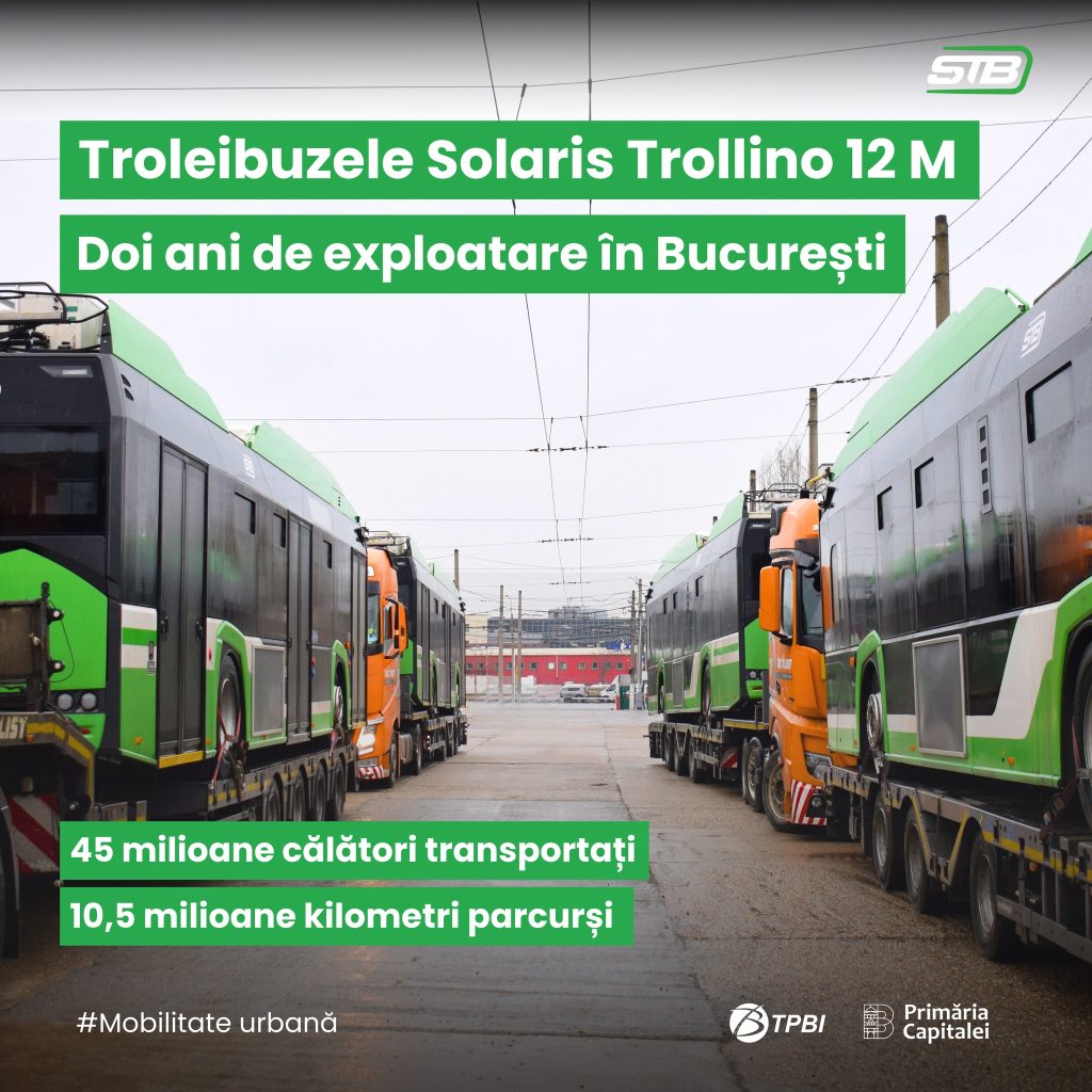 Societatea de Transport București (STB) marchează doi ani de la introducerea în circulație a troleibuzelor Solaris Trollino 12M cu autonomie, unele dintre cele mai moderne vehicule electrice din flota de transport public a Capitalei. Primele troleibuze au ajuns în București pe 18 ianuarie 2024, fiind livrate la Depoul Bujoreni, unde au început imediat testele și probele tehnice.