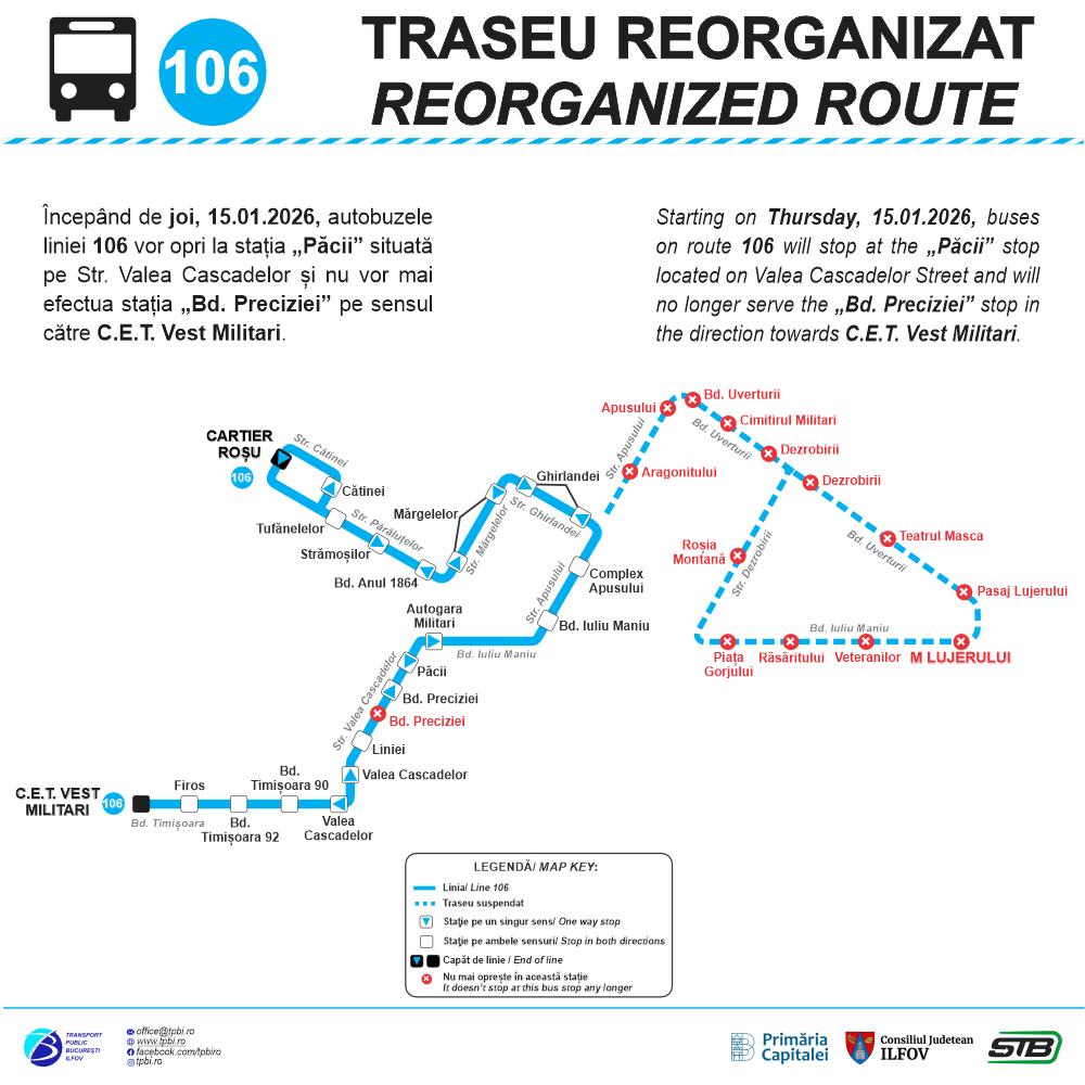 - Tot de la această dată, stația „Bd. Preciziei” se suspendă pentru linia 106.